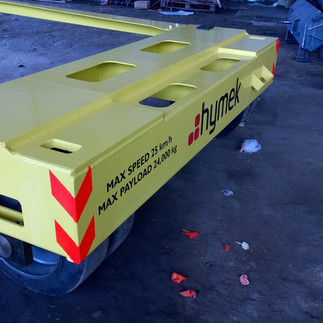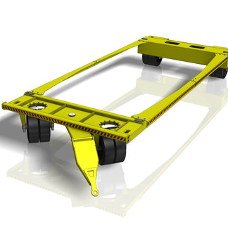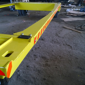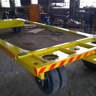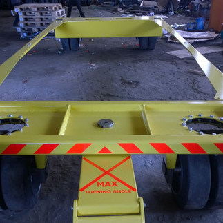 The unit was designed and built for the transportation of the offshore containers on the quayside. The challenge was to achieve a small turning radius and easily transportable unit while having a 24 metric ton load.